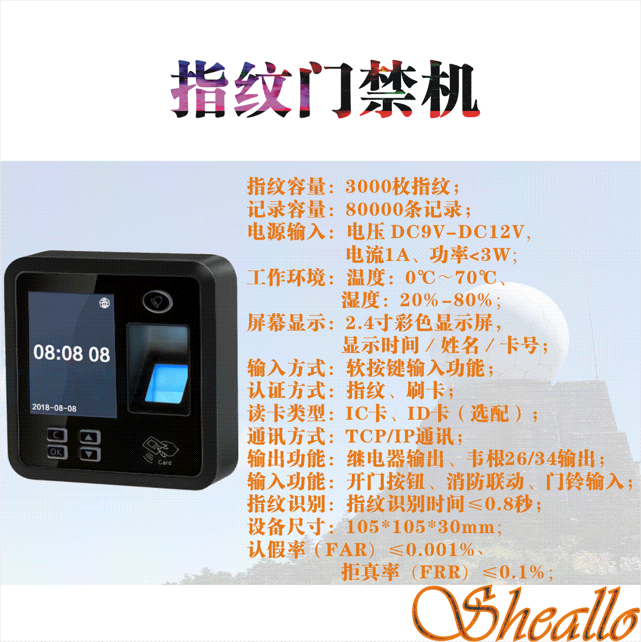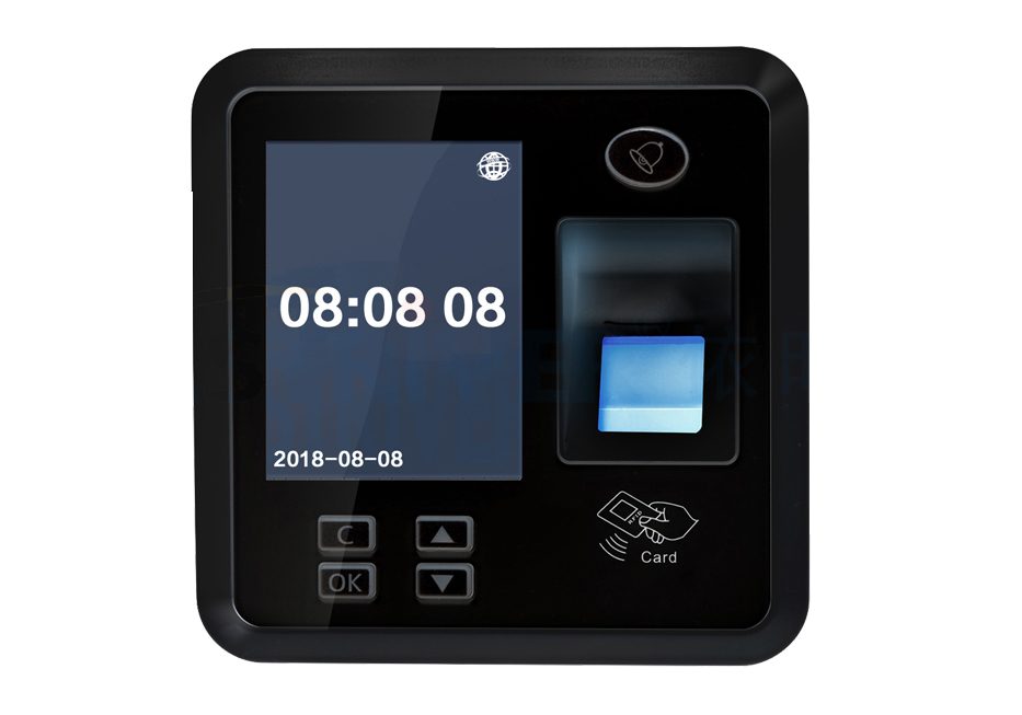 工业级Linux系统,性能更快、稳定性更强; 第五代高速指纹算法引擎,3000枚指纹,0.8秒瞬间通过,指纹识别率高达99.99%; 领先的第五代指纹自动学习引擎,通过自我学习,识别率效果更好,识别率速度更快; 按键采用软键盘输入,设备操作更方便直接; 2.4寸彩色显示屏,待机时可显示时钟,识别成功后可显示姓名、卡号; 高速网络接口,100M网卡芯片,高速的数据上传下载,支持实时数据上传功能; 支持记录循环存储,支持数据补采功能; 多种验证方式结合:卡+指纹、卡或指纹; 可以支持外接读头及输出韦根信号到控制器功能; 通过USB线与电脑连接,实现高速在线升级; 支持防拆、强制开门报警; 可设置10个管理员(指纹+卡号数量); 支持一路开门按钮输入、一路电锁控制输出、一路有线门铃输出; 支持消防联动功能;